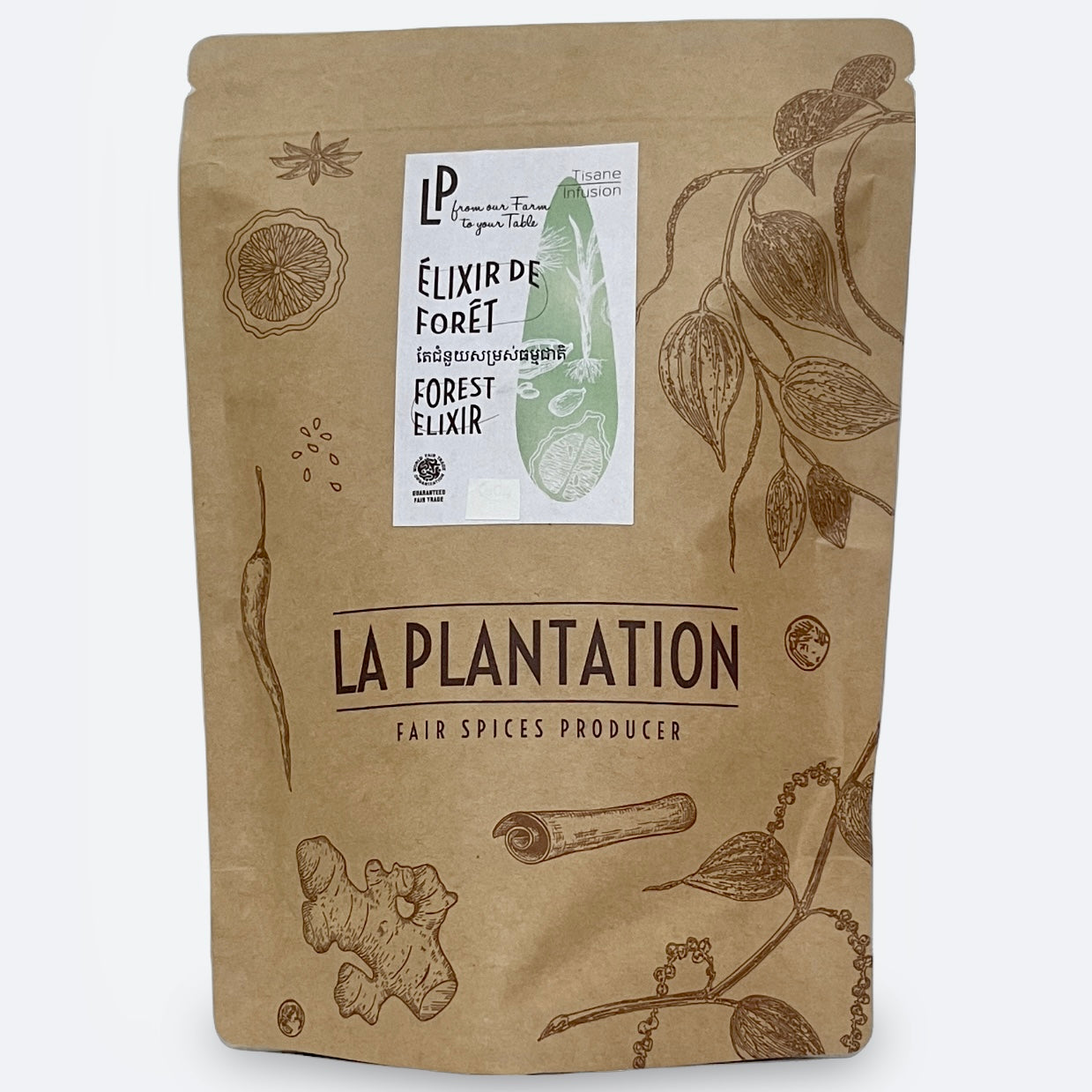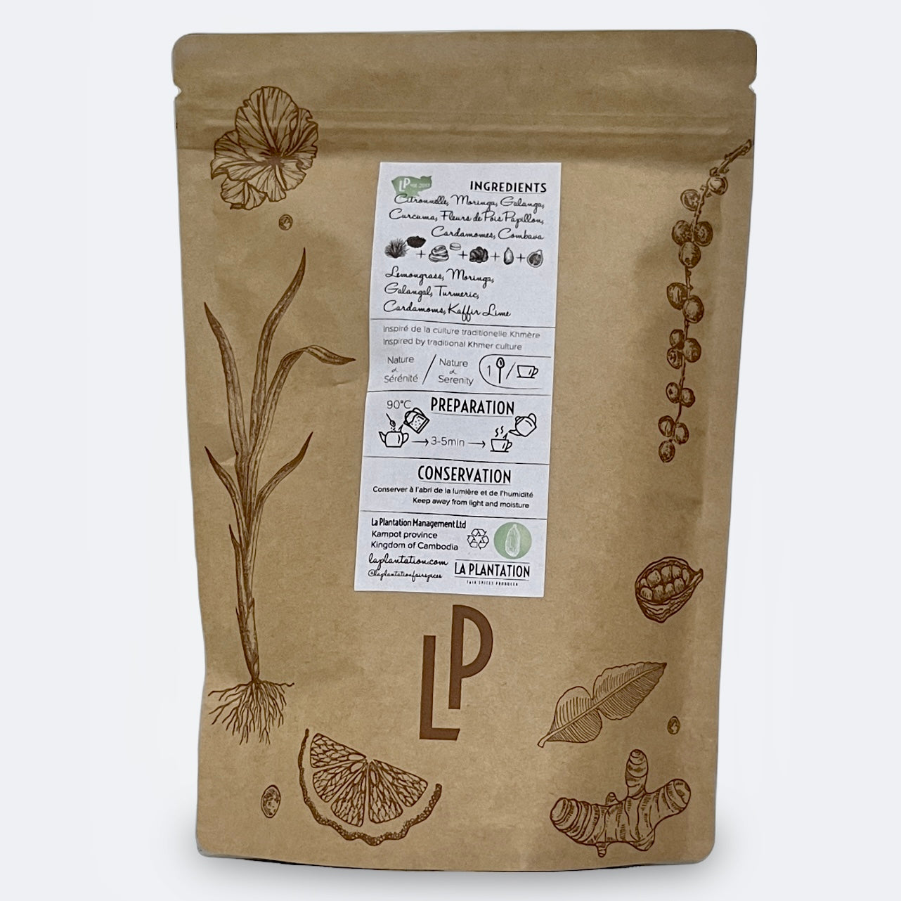 The aroma of this green herbal caffeine-free tea is reminiscent of a stroll through a boreal forest. Its bold flavour, in contrast comes from tropical ingredients harvested in Cambodia.