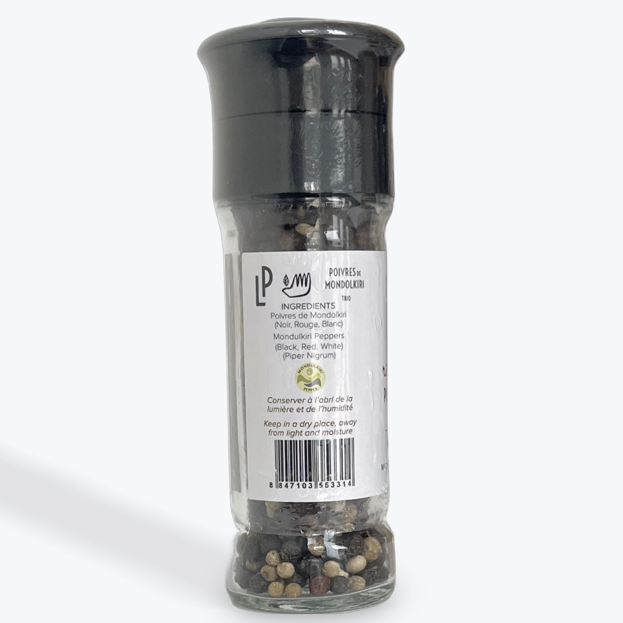 La mezcla de tres pimientas de Mondulkiri reúne los sabores más emblemáticos de la provincia de Mondulkiri, situada en el corazón de Camboya. Esta armoniosa combinación de pimienta negra, roja y blanca es una auténtica oda a la riqueza de esta excepcional región.